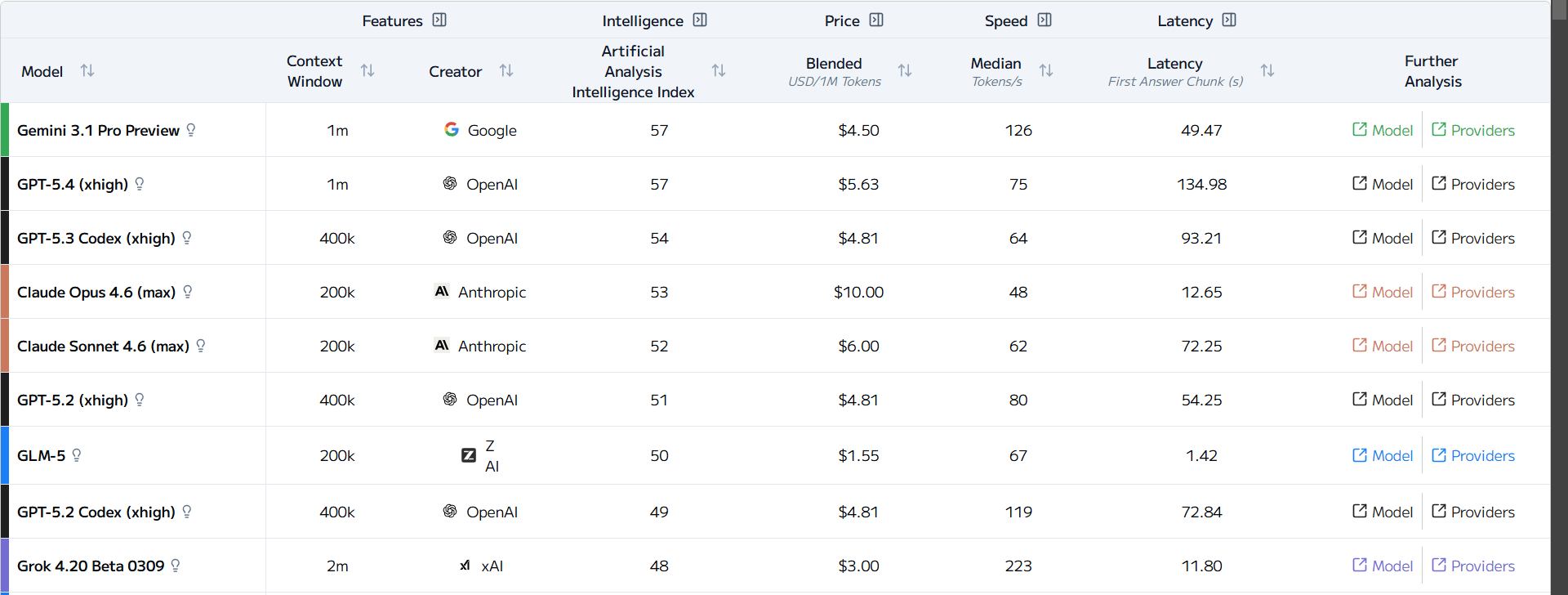 Now the LLMs. As of this writing, there are 3 clear winners: Opus 4.6, GPT 5.4 and Gemini 3.1. This will undoubtedly change in the following weeks. Here’s a snapshot from Artificial Analysis latest benchmarks: